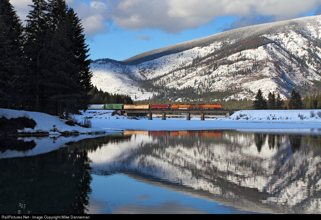 | An eastbound BNSF manifest freight crosses the inlet for Trout Creek where it enters the Clark Fork at Trout Creek, Montana, on February 23, 2017. |