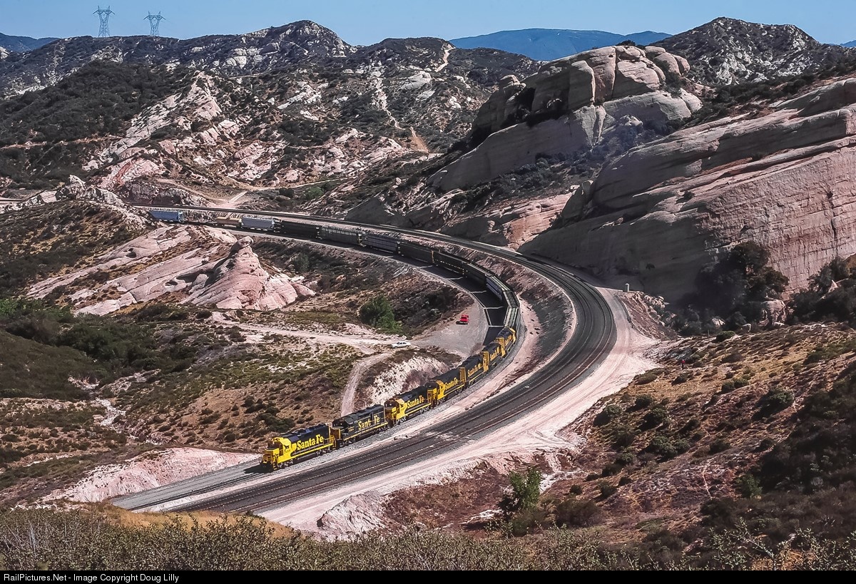 Arguably one of, if not the most iconic photo locations along the entire Santa Fe system is Sullivan’s Curve in Cajon Pass, made known to the outside world by photographer Herb Sullivan in the 1940’s. During a 1984 trip to cover Tehachapi and Cajon, some friends and I made the pilgrimage to Sullivan’s curve, where we encountered an eastbound 66-car manifest powered by a solid string of GP35’s with one GP30 thrown in the mix.