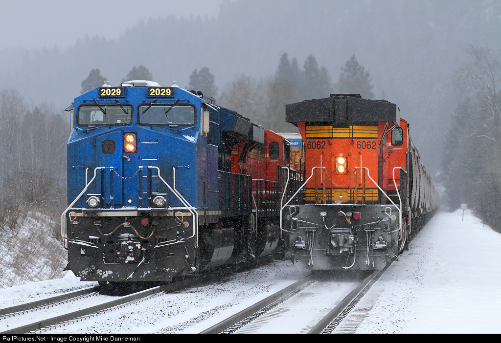 As BNSF GE ES44AC No. 6062 operating as a rear DPU on eastbound BNSF grain train passes by, General Electric Leasing (GECX) ET44AC No. 2029 is ready to head west with a BNSF freight at Algoma, Idaho, on a snowy February 27, 2017. No. 2029 is painted in a solid blue “demonstrator scheme” used on these early Tier 4 ET44ACs.