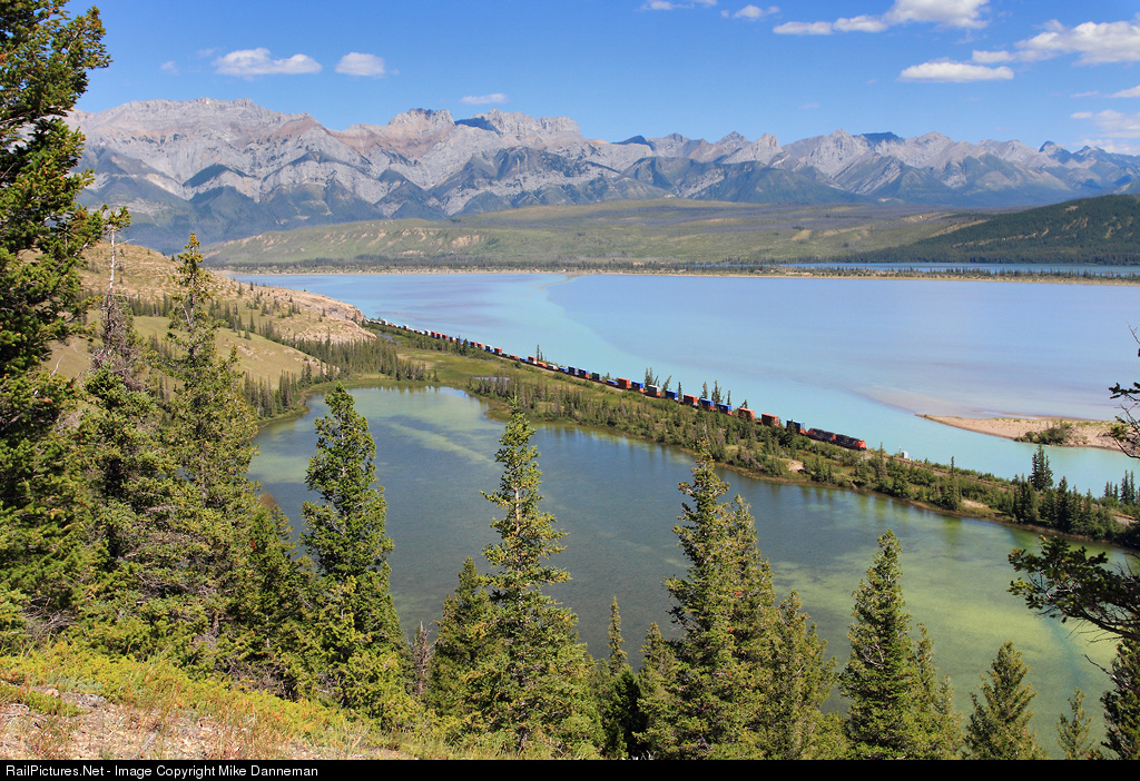 Dwarfed by the rugged scenery of Jasper National Park, Canadian National intermodal train No. 119 passes Jasper Lake just west of Devona, Alberta, on July 16, 2013.