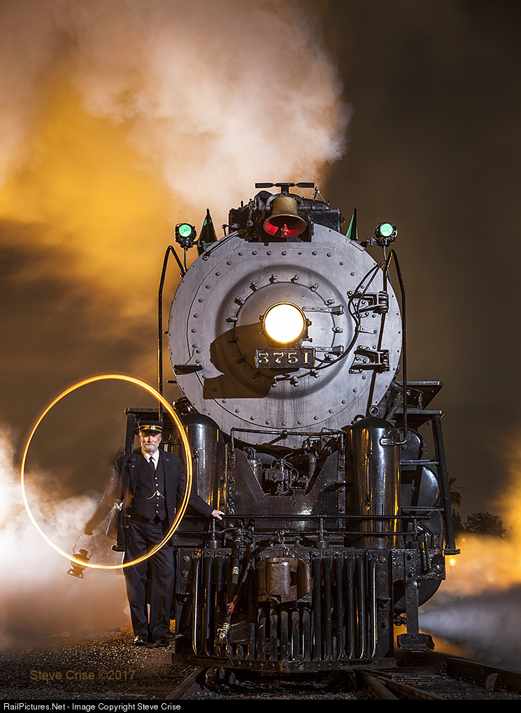 Conductor Steven Phares is on the footboards of ATSF 3751 sporting a vintage Santa Fe conductor’s uniform complete with kerosene fueled hand lantern. This scene was part of a fund raising shoot for the San Bernardino Railroad Historical Society to help defray the costs to bring the 3751 to Fullerton Railroad Days event, which was held on May 5 & 6 2017. The SBRHS will soon begin the necessary repairs required by the Federal Railroad Administration to bring her into compliance with the one thousand four hundred seventy-two (1472) service day inspection. This process could take up to two years to complete. Your donations would be greatly appreciated. Please visit www.SBRHS.org to find out you can help keep her on the rails and running! - Steve Crise ©2017