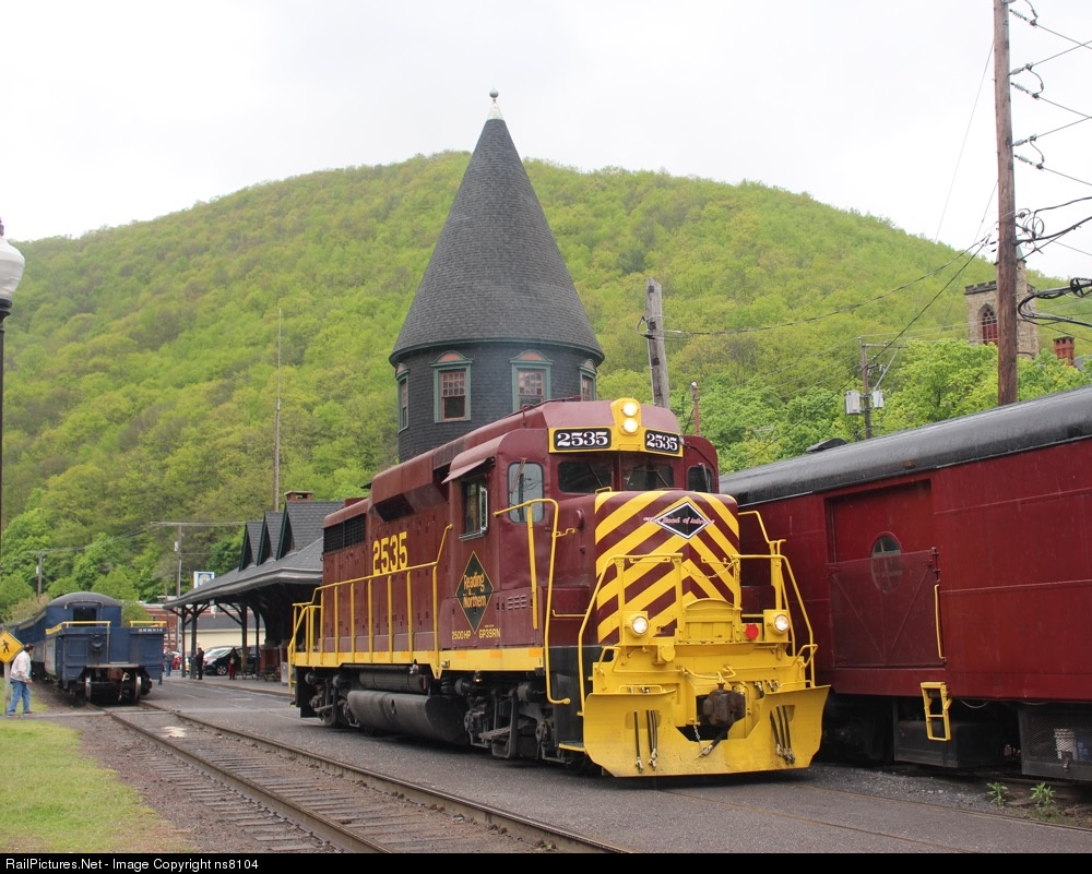 | RBMN GP39RN number 2535 makes its first run around move at the Jim Thorpe Station after making its first trip into the Lehigh Gorge, for the Lehigh Gorge Secnic Railroad after being rebuilt by the Reading and Northern at their Port Clinton shops and painted in the special Maroon Passenger service scheme. |