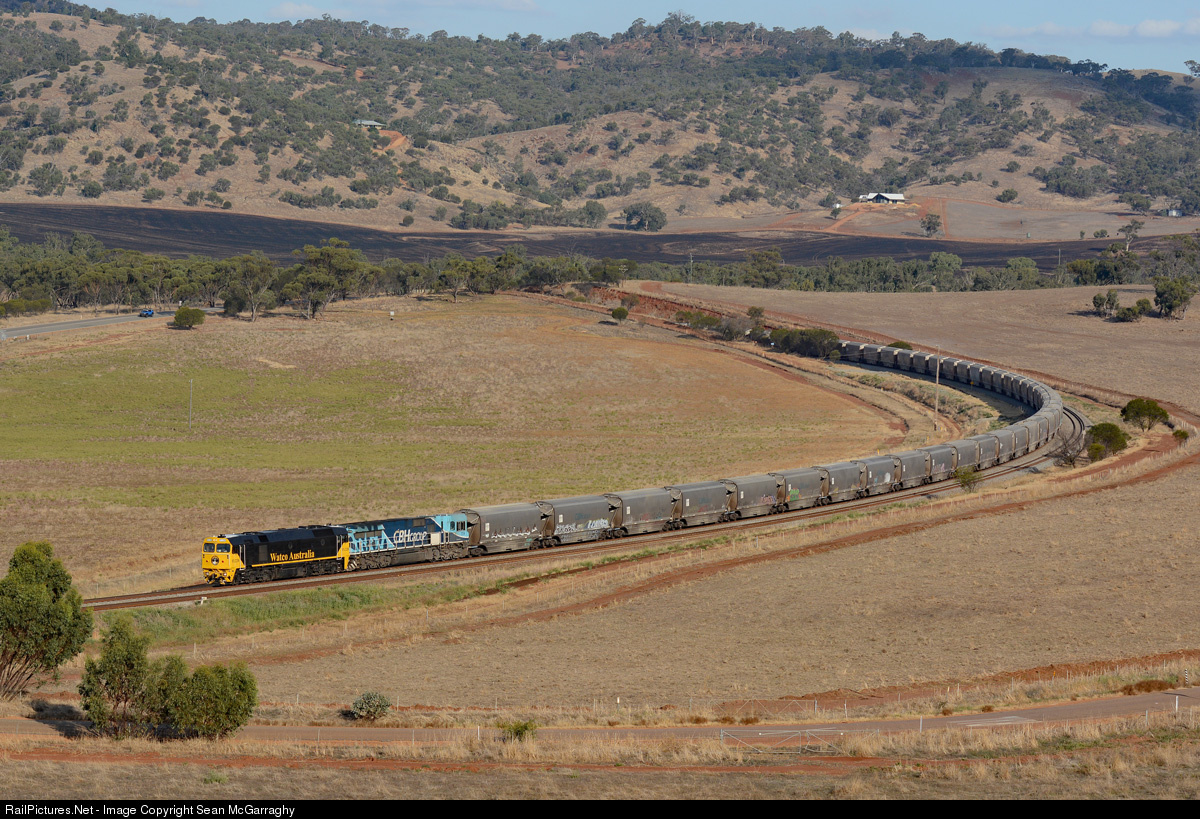 | Owing to trackworks at a level crossing in the town of Toodyay, only 3km away from this location, 7S56 loaded up grain train is seen rounding the curve at Lloyd's Crossing, Toodyay on the down main. FL220 & CBH119 have been given the task of working the train from Cunderdin to Kwinana with the FL on spot hire to CBH from Watco WA Rail.