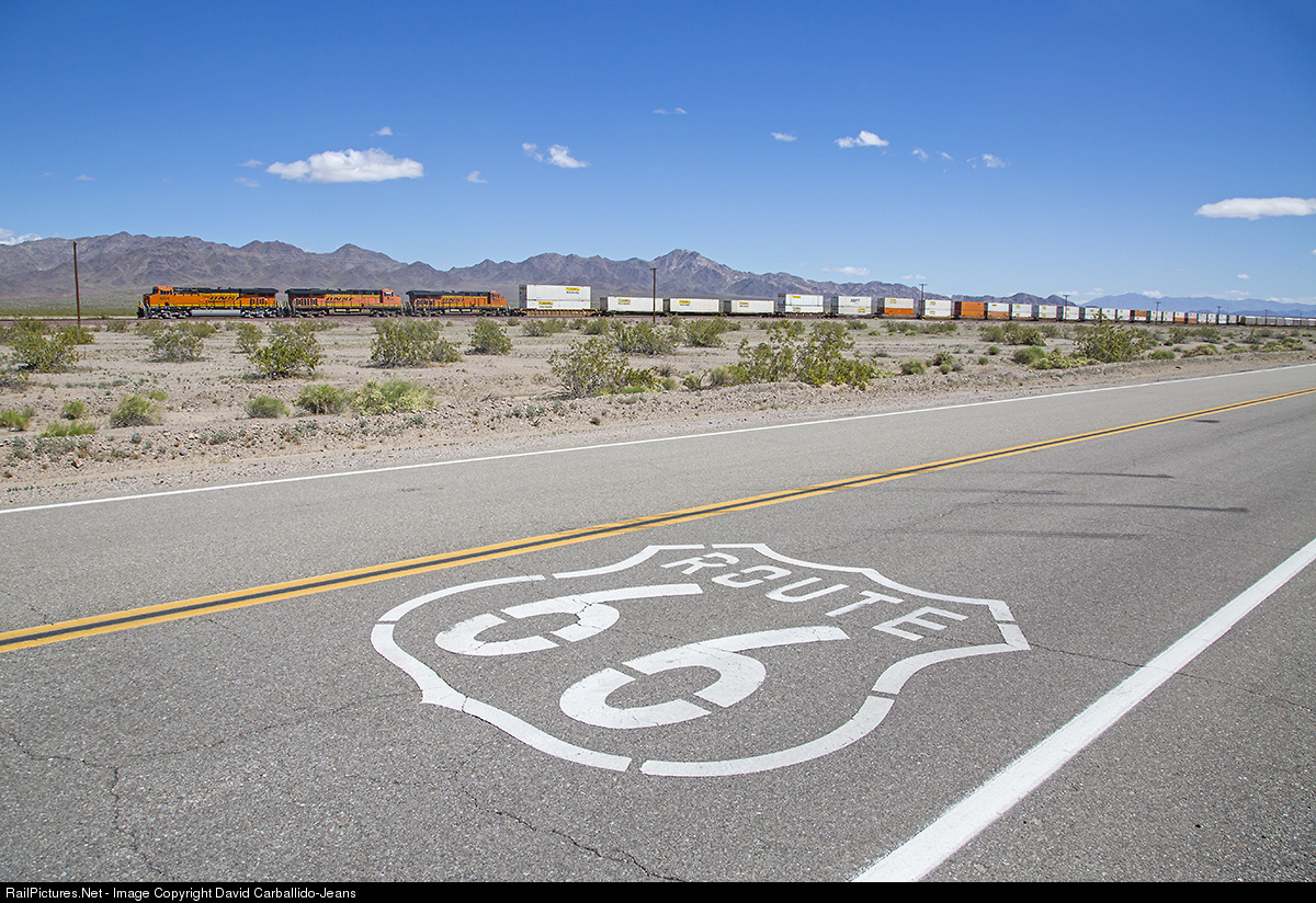 Getting your Kicks on Route 66...Nothing scream southwestern railroading like Route 66 and the Santa Fe. Majority of Route 66 follows the former Santa Fe Transcon from Los Angeles to Chicago. Crossing the eastern Mojave Desert is where you truly see the connection of these two iconic forms of transportation. In the lonesome town of Amboy, CA, Route 66 parallels the 70 MPH tracks of the BNSF Needles Subdivision. Here, the classic Route 66 signs are painted on the highway. In the background, one of the one-hundred trains in a 24 hour period races across the harsh desert landscaped. With three pumpkin colored BNSF locomotives on the point, they have no problem tackling the grade of Ash Hill with their mile-long cargo of FedEx mail.