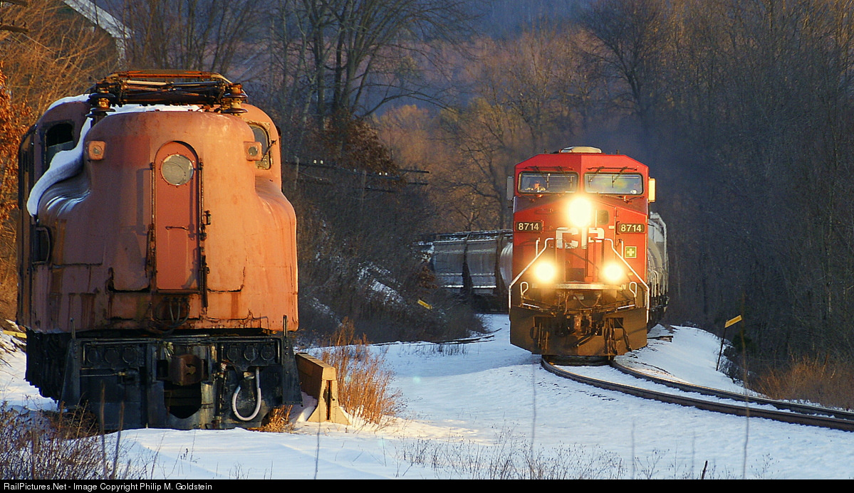 | The sun sets on CP252 passing GG1 #4934 at Cooperstown Junction. This scene, no longer possible; as the GG1's have been moved north up the Cooperstown & Charlotte Valley line, and as Norfolk Southern purchased the line from Canadian Pacific 8/15/2015.