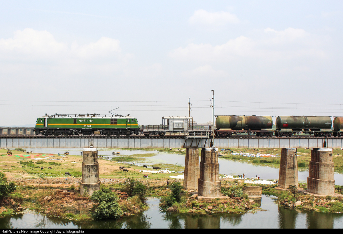 WAG-9 from LALLAGUDA shed with petrol consist crossing Penna river as people are busy with their work and cattle grazing under the bridge