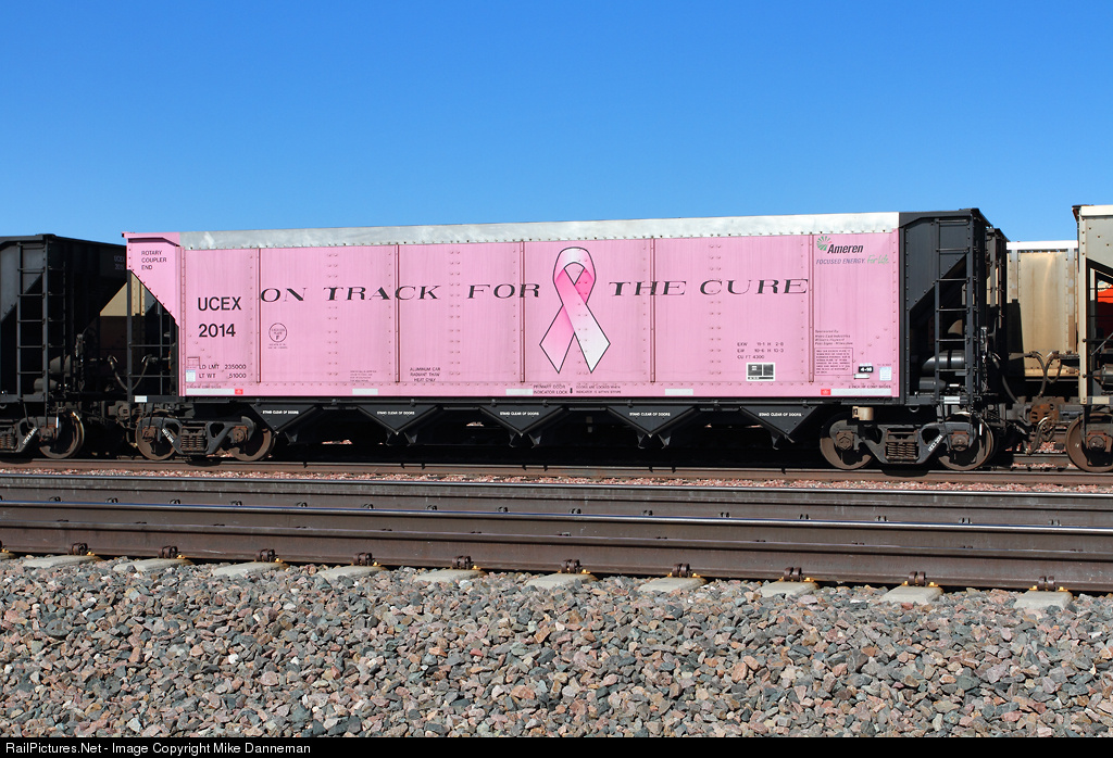 A pink coal hopper? Yes, Union Electric Company/Ameren has UCEX No. 2014 painted pink to support breast cancer awareness in its coal-hauling fleet of hoppers. On July 3, 2016, “On Track for the Cure” No. 2014 sits at Bill, Wyoming, waiting for another load of Powder River Coal. In addition to the the pink ribbon, small lettering on the right side states that the special colors are “Sponsored by: Metro East Industries, William Hayward and Fast Signs-Milwaukee.” Just remember, the rotary coupler end is the pink end.