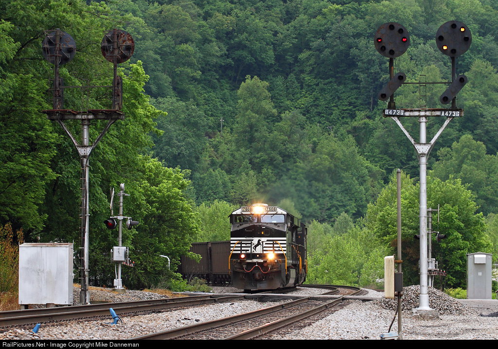 About to cross Falls Branch Road grade crossing and pass the 4737 and 4736 color position light signals is a westbound Norfolk Southern coal empty rumbling through Chattaroy, West Virginia, on May 15, 2014.