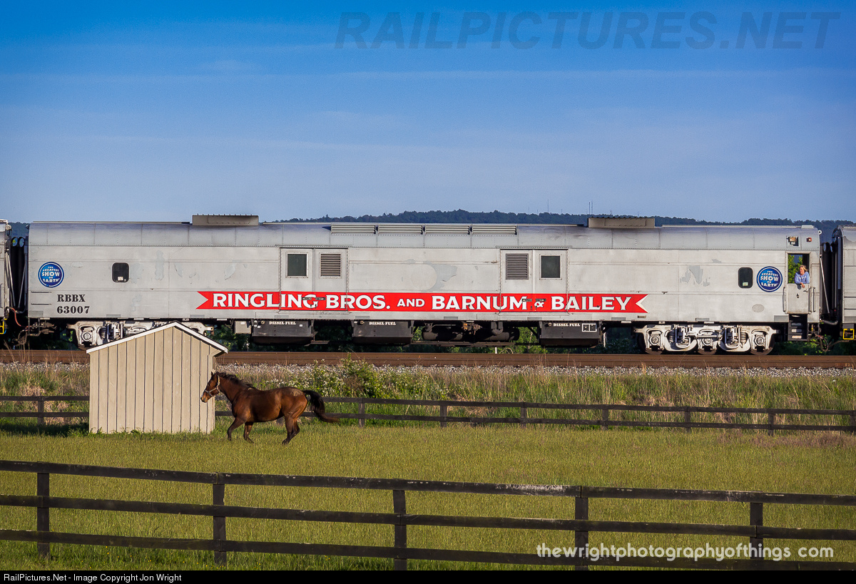 | A horse races the cars on the last Ringling Brothers and Barnum and Bailey Circus train as an onlooker from the train takes in the scenery as the "Greatest Show on Earth" heads to it's final stop in 147 years before being disbanded. |