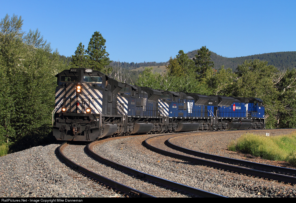 A Montana Rail Link helper set curves into Austin, Montana, on June 29, 2016, heading back to Helena to help another train up Mullan Pass. Note how No. 4302, the eastern locomotive in the consist is the most filthy—this is due to being the last unit into Mullan Tunnel, and getting the most exhaust and dirt from the lead locomotives. MRL really does try to keep their locomotives clean, but helper service up the demanding 2.2 percent mountain grade of Mullan takes its toll on cleanliness quickly.