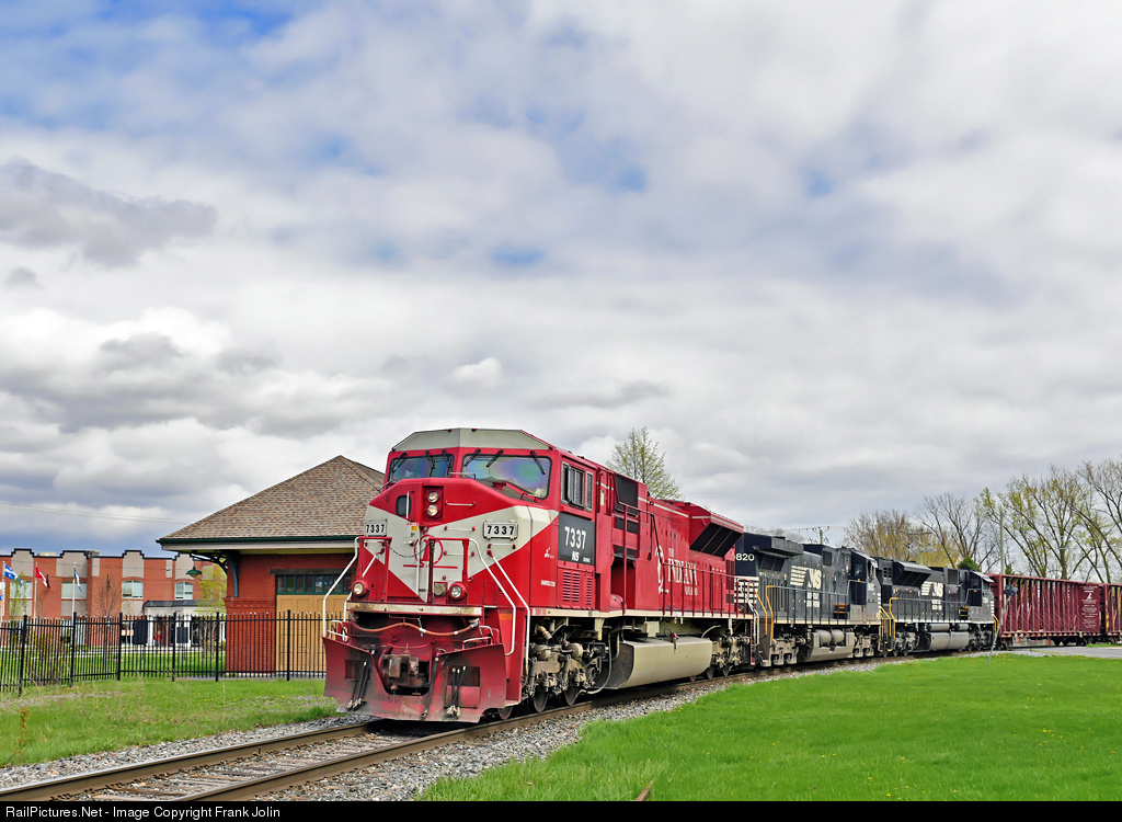 A special guest in town, Ex-Indiana Rail Road SD9043MAC leads Canadian National #529 toward Montreal as it passes by the old Grand Trunk depot at St Jean.