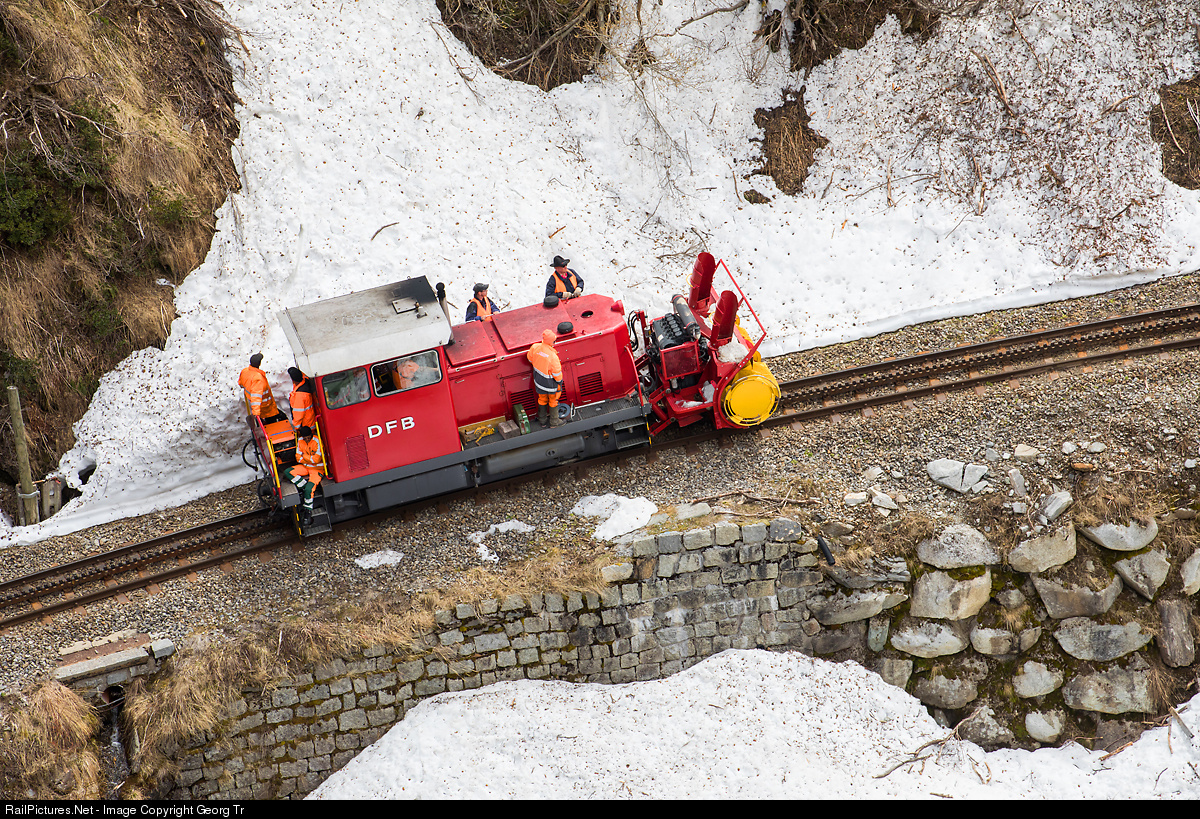 | Snow clearance on the Furka pass line of the Dampfbahn Furka Bergstrecke (DFB). The crew is returning from the lunch brake in Realp to the work place between Alt Sennstumstaffel III and II tunnels. The cogwheel diesellocomotive HGm 2/2 # 51 came to the DFB in 1986, here she is fitted with a front snow blower. |