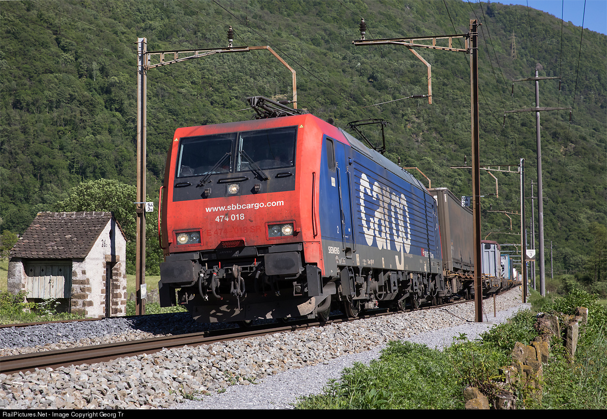 | Re 474 # 018 of the SBB, a Siemens ES F64 F4 from 2005, is pulling the northbound Hupac train 42028 from Gallarate (Busto Arsizio Terminal) to Köln Eifeltor near Claro towards the Gotthard Base tunnel. |