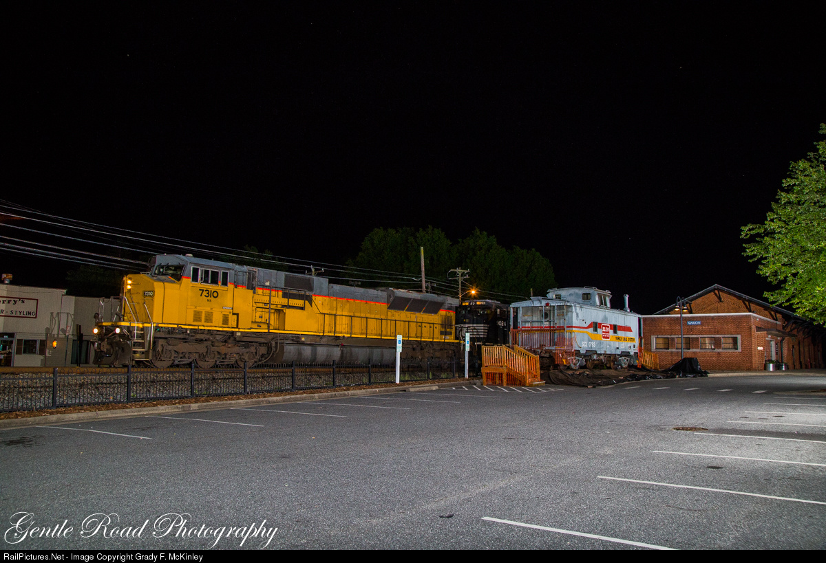 | Parts of four different railroads can be seen in this one image. Former Union Pacific power passes a Southern Railway station with a Seaboard System caboose on display. All while using Norfolk Southern rails. |