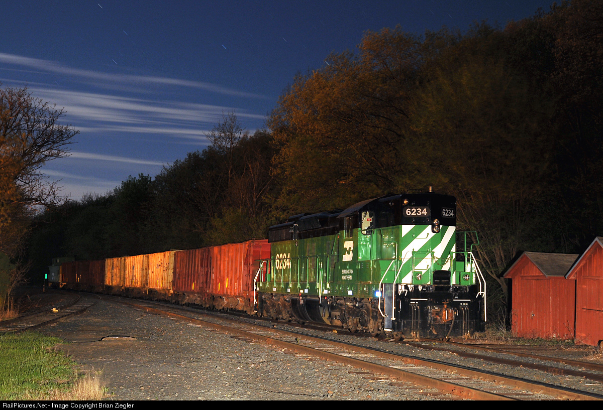 On the evening before pulling a 8 car ballast train for a photo freight shoot, Minnesota Transportation Museum locomotive 6234 dressed in Burlington Northern Railroad livery sits on the house track at Osceola.