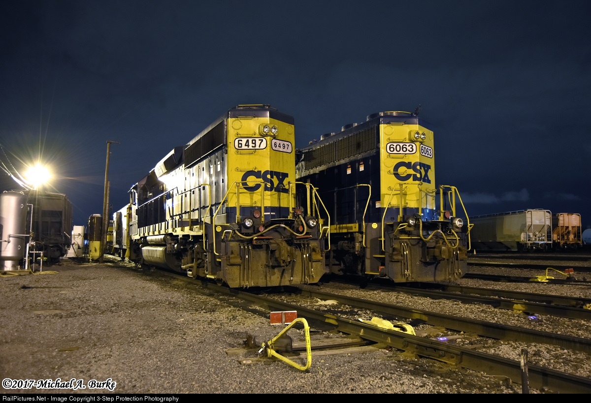 | A pair of GP40-2s await there next assignment on the engine tracks in Rochester yard. CSX 6497 is former Chesapeake & Ohio 4389. CSX 6063 has a more interesting piece of history. It was built in September of 1972 as Baltimore & Ohio 4164, then later repainted solid gold and renumbered as GM50 to celebrate General Motors 50th year of building locomotives. |