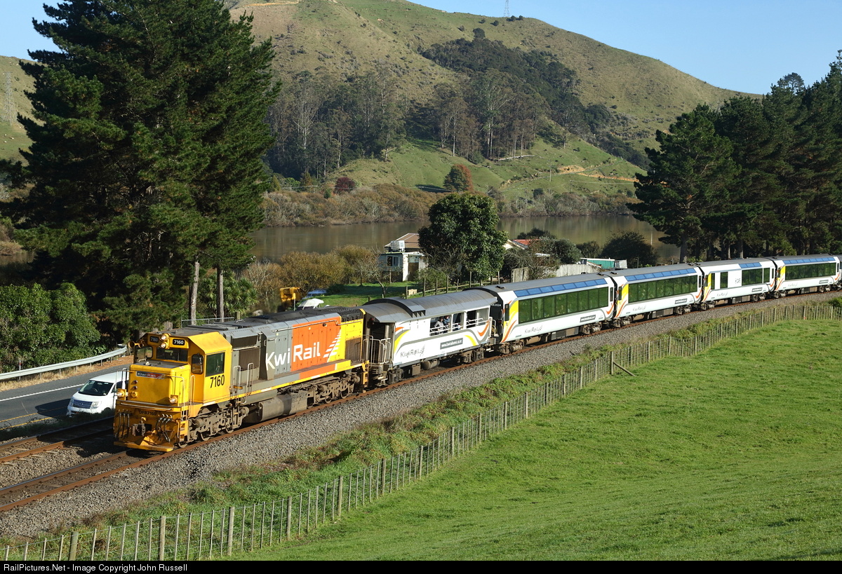 | The Northern Explorer commenced the Auckland - Wellington run in 2012 and is affectionately known as "Dora" by rail workers and fans. The popularity of this train and the the other Scenic Journeys trains Tranz Alpine and Coastal Pacific has KiwiRail considering additional cars, this time likely built overseas since the virtual closure of works at Hillside, Dunedin where the design awarded cars were built. The river in this view is Waikato, the longest in New Zealand.
