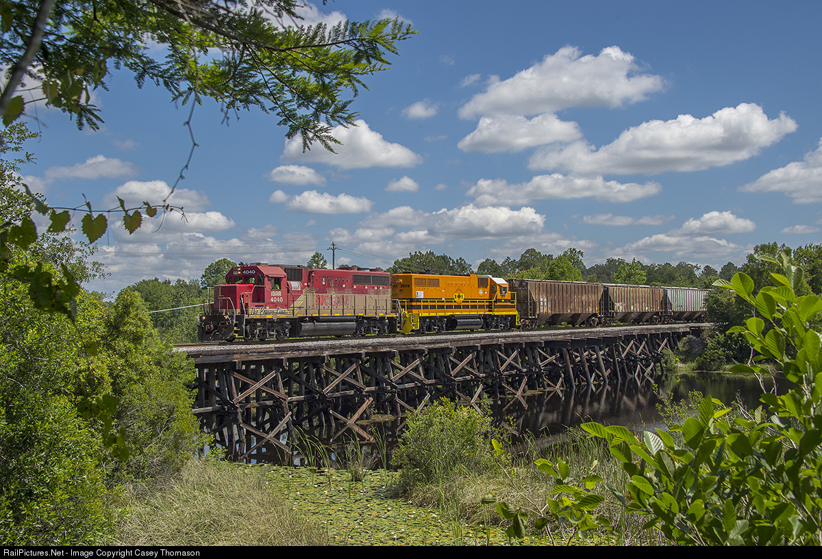 | Working under the G&W umbrella, Indiana Southern GP40 #4040 leads a Bay Line fertilizer train south across Bayou George into Panama City, Florida. |
