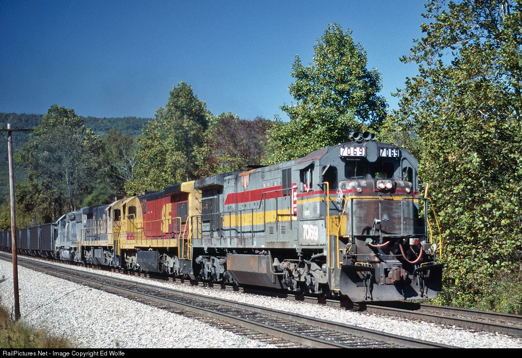 CSXT 7069 appears to have seen its better days as it leads a unit coal train, running on NS trackage rights, at Tito. Note that the second engine in the consist, SF 8079, is painted in the "Kodachrome" scheme of the failed SP-SF merger. The loaded CSXT consist will meet an empty NS train before continuing on its journey.