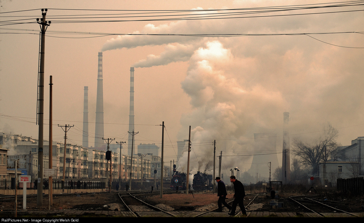 Early morning at the crossing People walking, people talking Going to work or going shopping Rickshaws for hire, bicycles galore Telegraph poles and power lines Rows and rows of flats abound Shiny rails and coloured lights Steaming engines standing proud Smoking stacks and cooling towers Dust and smoke makes breathing hard Another day in China’s smog