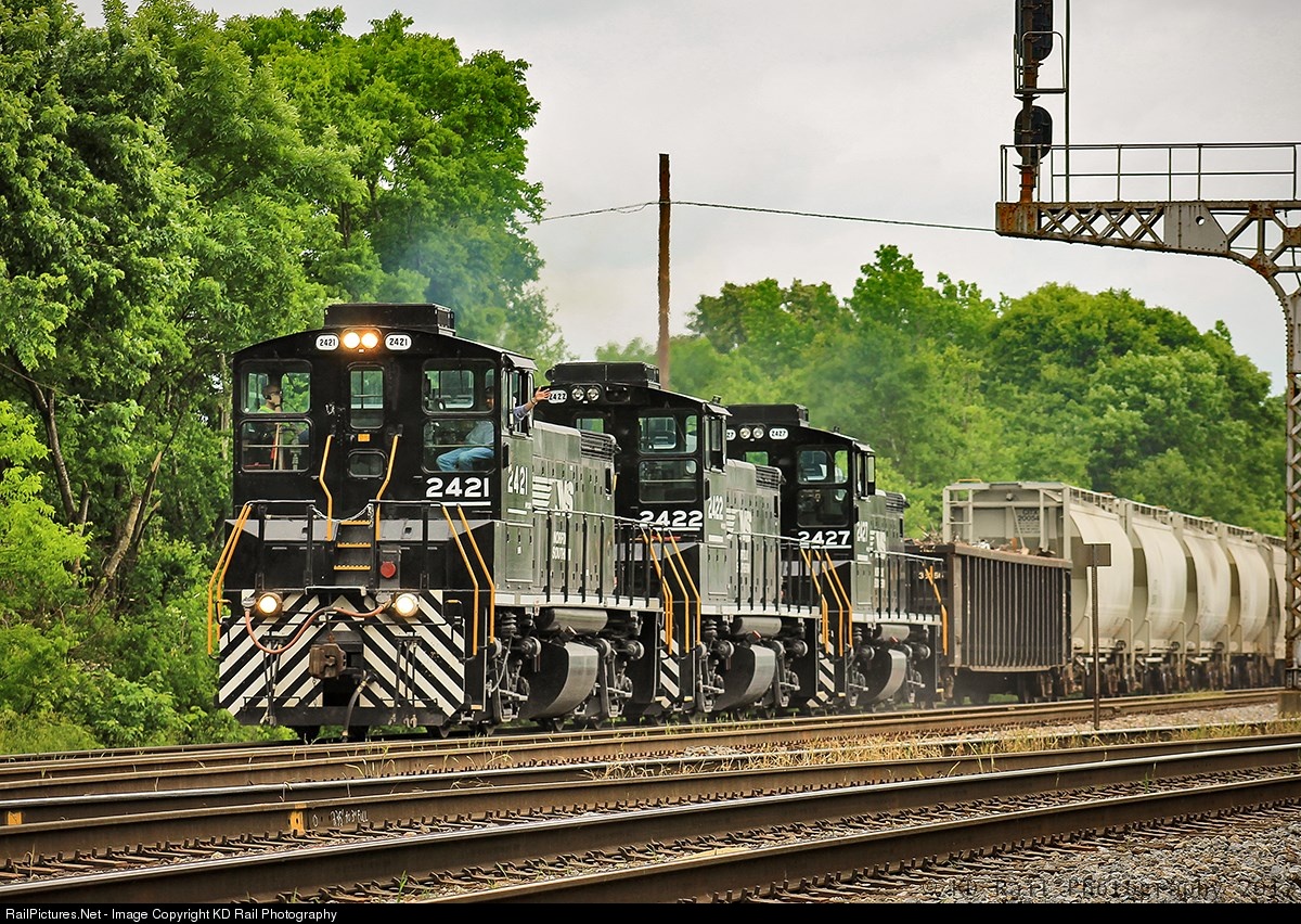 NS TC18 Red Bank Local is seen passing the single head Southern Rwy Cantilever signal bridge on the main 2 track at control-point Citico Jct (332.4) on the NS CNO&TP 2nd District/Chattanooga Terminal (CT), with a trio of "buttheads" in charge of the heavy local job. TC18 serve the Red Bank branch, and the North Chattanooga Industrial park on the Tennessee River in town which was part of the small rail business the Chattanooga Traction Co. which started off as a trolley operation, than became short line which eventually became part of a subsidiary of the Southern Rwy. At the time the trio of MP15DC's were assigned to the branch due to the tight curve and light rails on the line which restricted six axle power to be use on certain section of the branch line. TC18 will run to the East-side Arrival/departure lead for debutts yard to drop the 30 car train off, and eventually will run back to the branch with a train for the customers. Unfortunately the trio of the MP15DC's were retired, and now theirs a road slug/mother set running the branch as their replacement.