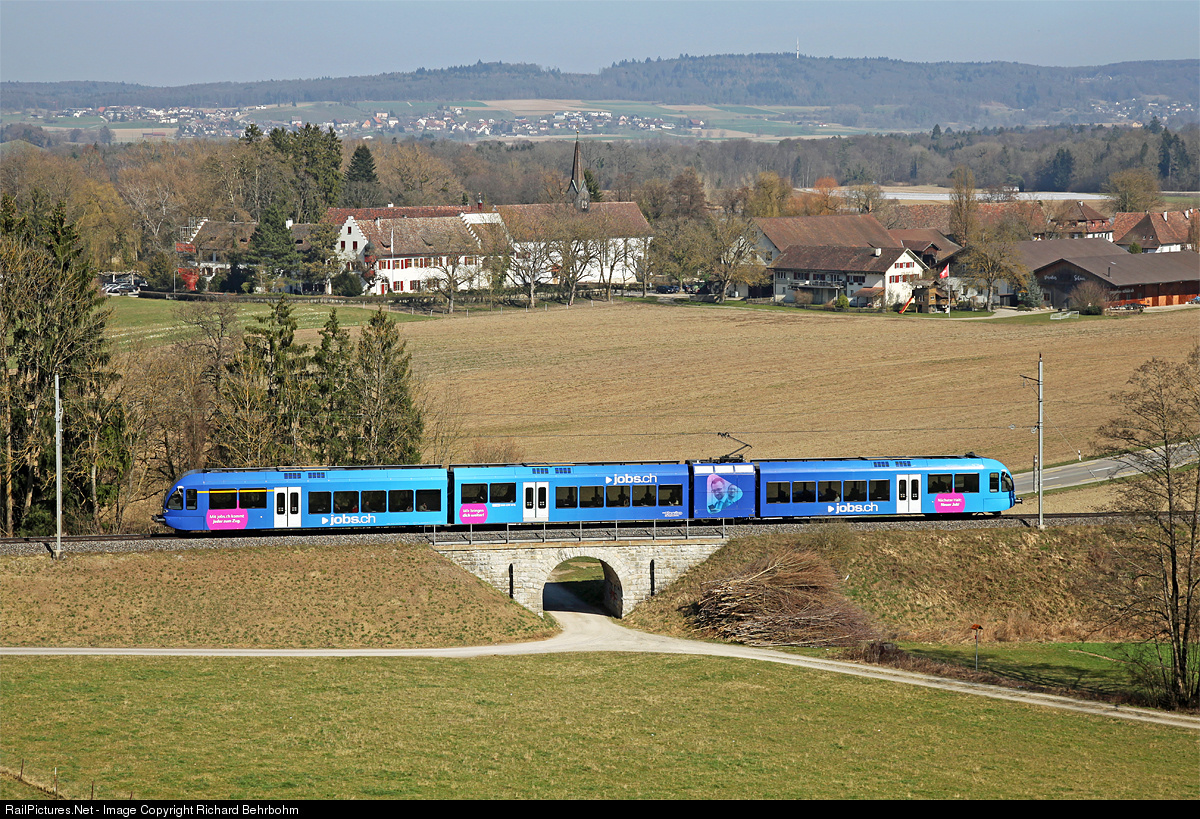 | The articulated lowfloor trainset "GTW" RABe 526 801 of Thurbo has a publictiy paint for "jobs.ch", an online job portal in Switzerland. |
