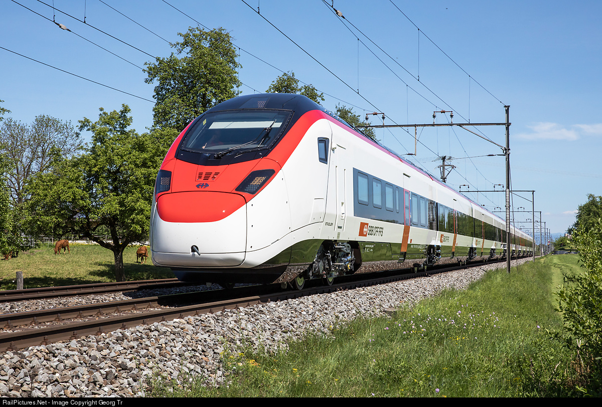 | The first swiss built highspeed train "Giruno" (250 km/h/ 155 miles p.h.) from Stadler Rail for the SBB made another series of test runs on the Thur valley mainline between Sulgen and Romanshorn. The outside paint scheme of the RABe 501 # 001 has changed a bit since the first runs, the red of the doors isn't reaching so high any more. The train is between Amriswil and Oberaach. |