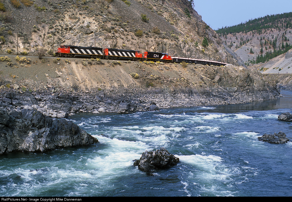 Along a low, but still turbulent Thompson River is a westbound Canadian National freight east of Morris, British Columbia, on September 27, 2001. Power on the train is a pair of EMD SD50Fs, Nos. 5443 and 5409, along with rebuilt SD40 (SD40-2Q) No. 6024.