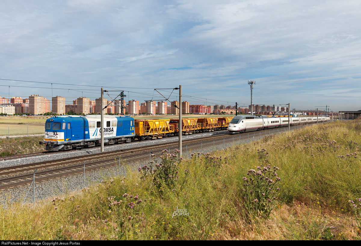 Alstom Series 100 Madrid-Alicante passes beside a balast train working in Madrid-Levante HSL section between Madrid-Atocha and Torrejon de Velasco.