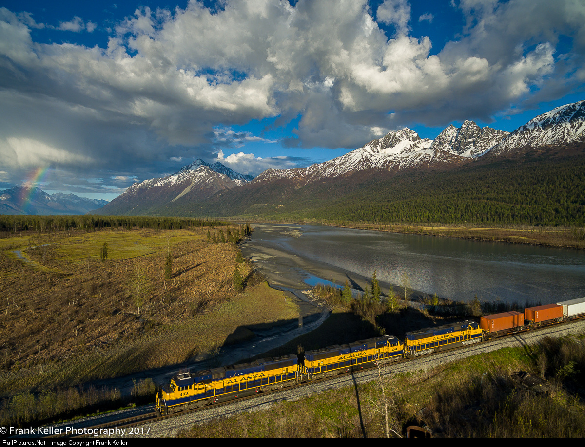 | On a glorious day in Alaska, if only the rest of the summer could be like today, the Alaska RR's 5 day a week freight to Fairbanks crosses the Knik River. Roughly 30 miles and 50 minutes into their 12 hour journey to reach Alaska's second largest city. Tonight their train consists mostly of pigs and a few interchange cars off the barge. This is the next view after my previous post, just out of sight in that first post was this rainbow. |