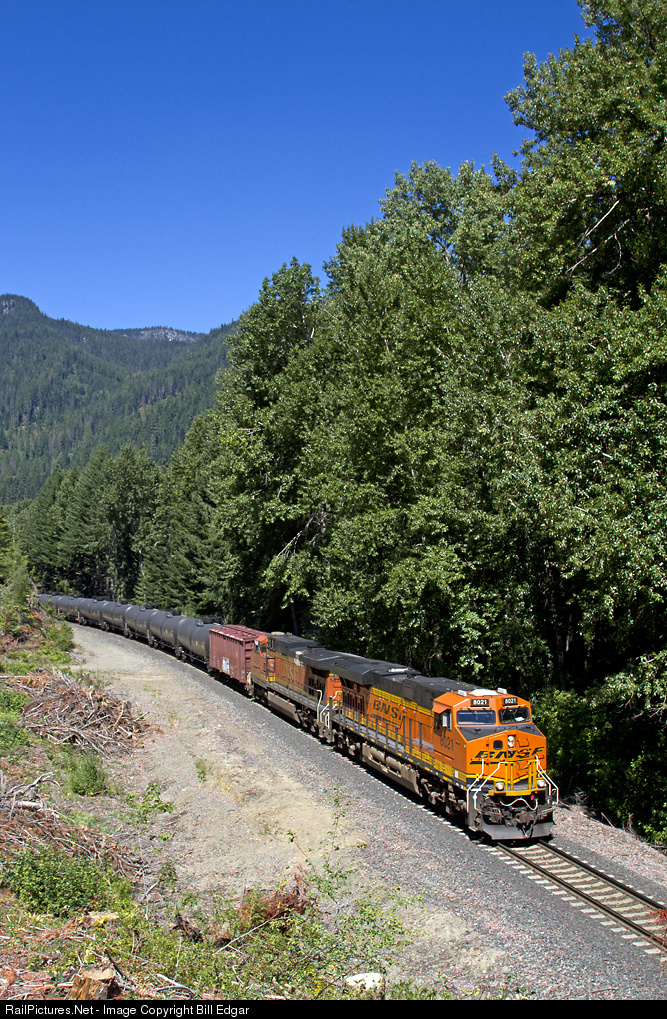 | BNSF 8021 rolls an empty oil train east off Stevens Pass through Merritt, WA on its way to a crew change at Wenatchee. A recent clearing effort has resulted in this view opening up for photos. |