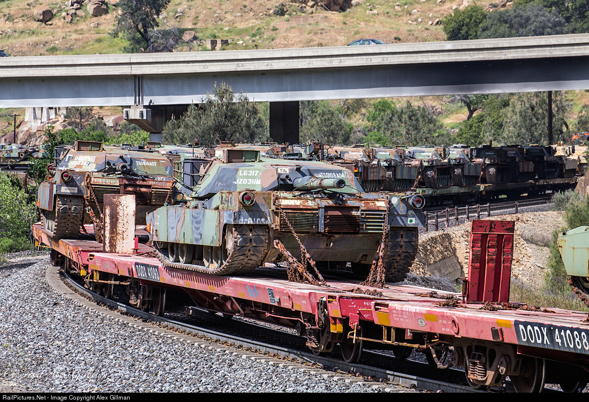 Over 8,000 tones of worn Abrams tanks are seen being slugged upgrade into Woodford on a warm afternoon on Tehachapi. Making a somewhat rare appearance on a DODX train, two mid-train DPU's can be seen just behind the trees to the right as double and triple axle flat cars carrying these machines of war scream as their flanges hug the rails while negotiating the many curves here.