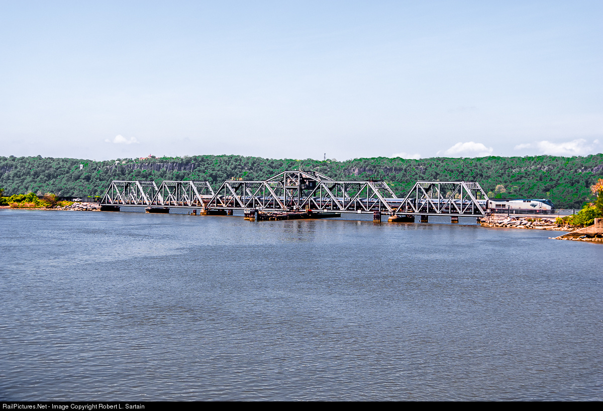 Amtrak Empire Service train 233 rolls westward across the Spuyten Duyvil swing bridge behind P32AC-DM 715.