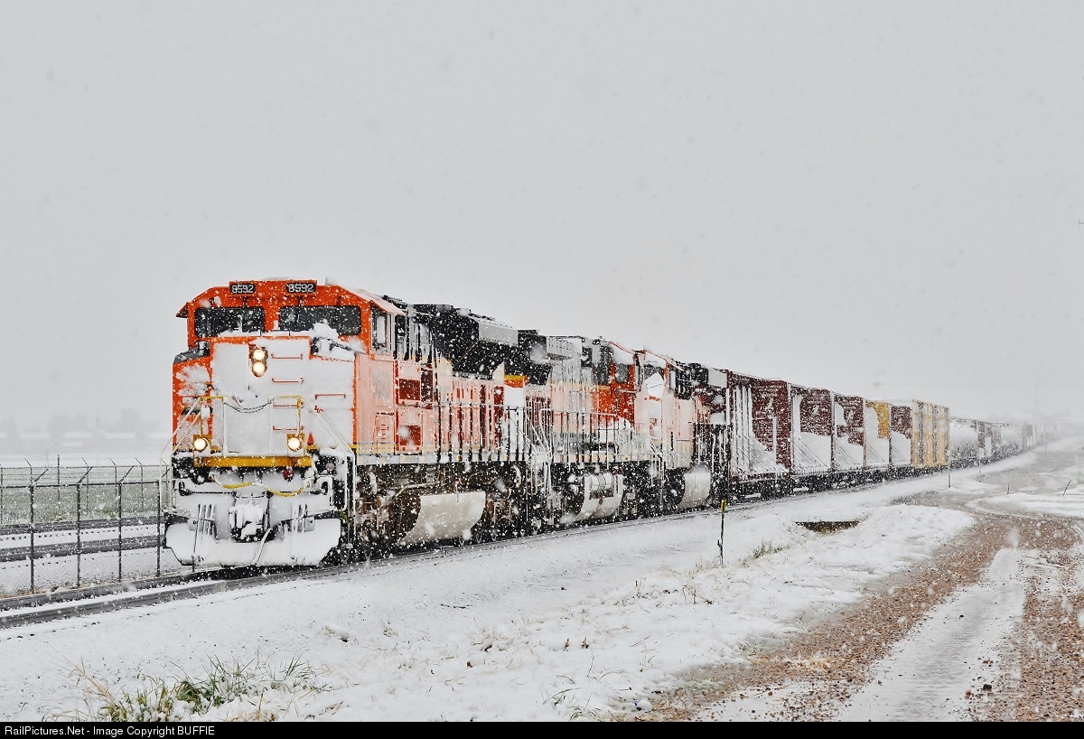 BNSF 8592 pushes forward into the heavy spring snow storm as it heads from Colorado to Wyoming.