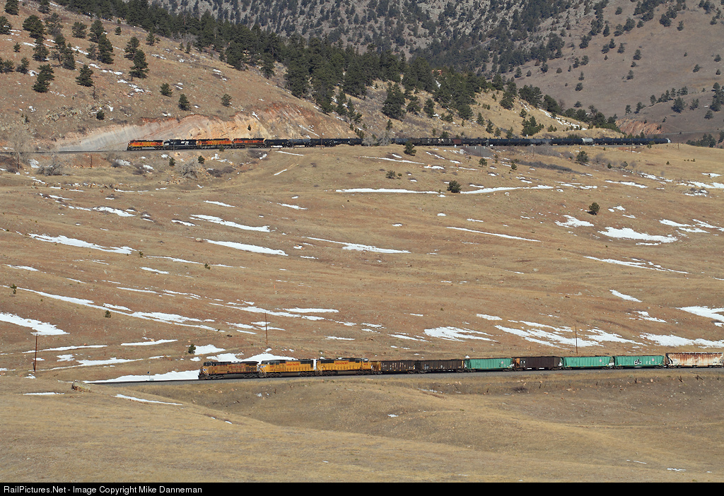 Below, a westbound Union Pacific freight waits in the siding at Rocky, Colorado, while an eastbound BNSF manifest freight above cruises through Clay on February 23, 2011. The trains are separated by a couple of miles of single track, with the BNSF soon to meet the UP train after negotiating Big 10 Curve that separates the two sidings.