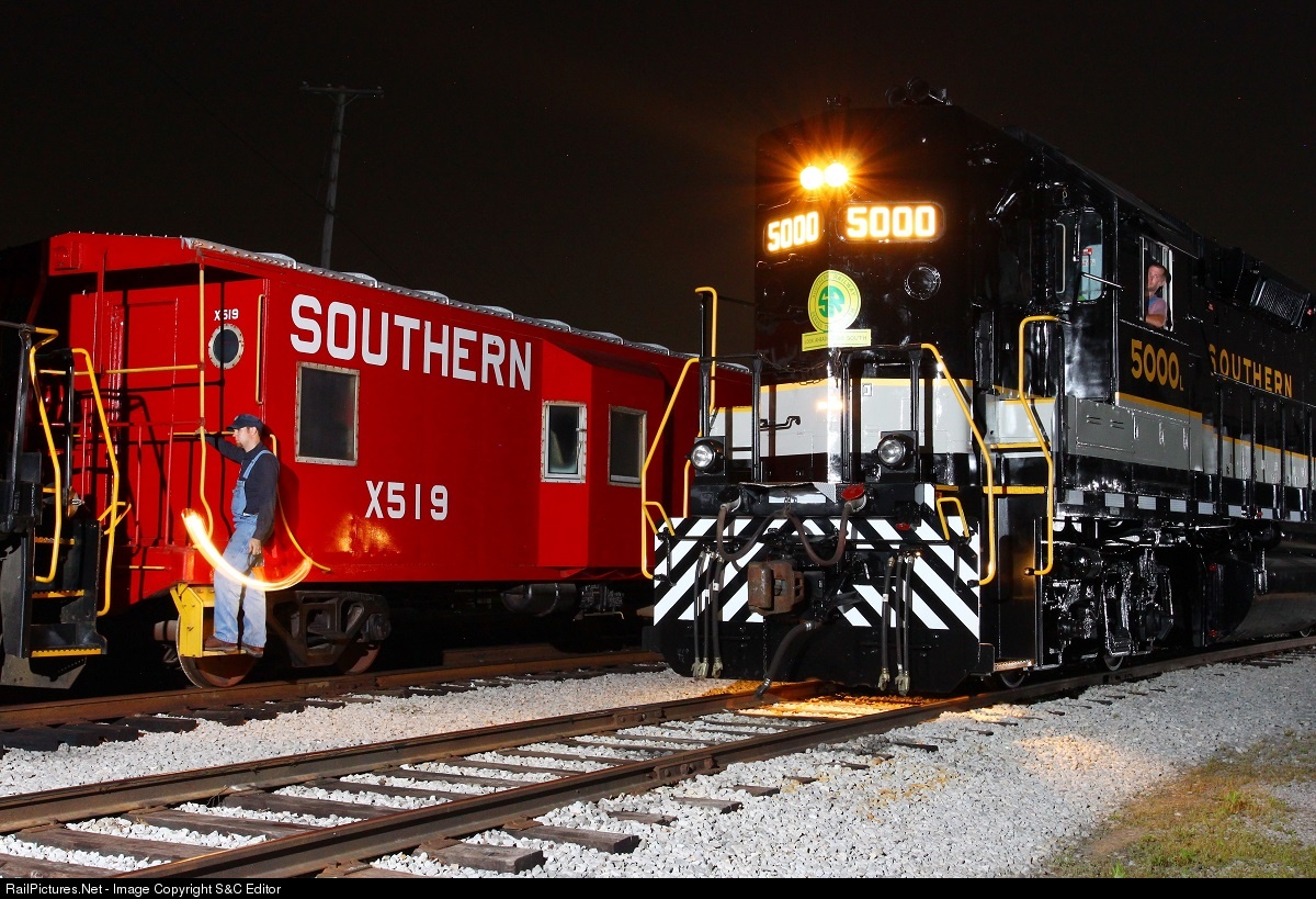 Southern GP38-2 "class unit" #5000 is displayed at the Tennessee Valley Railroad Museum's Grand Junction Terminal shortly after repainting into the classic "tuxedo" scheme. Joining in the fun is recently-lettered ex-SR caboose X519. Lighting courtesy "Friends of the Southern Railway Historical Association." Turning back time to the 1970's?