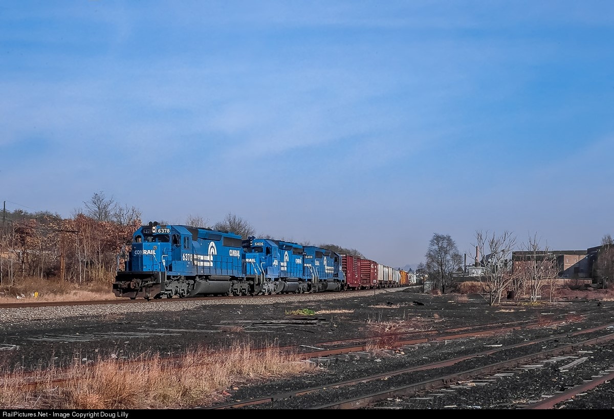 | Conrail train ALCG (Allentown – Corning) rolls past the remains of the New Jersey Zinc Company plant at West Hazard (Palmerton), Pennsylvania. The motive power for today’s train is a little out of the norm, with three SD40-2’s. Typically the power was three six-axle GE’s with a GP38 or GP38-2 to be swapped out as the plant switcher at Proctor & Gamble’s Charmin paper mill in Mehoopany. |