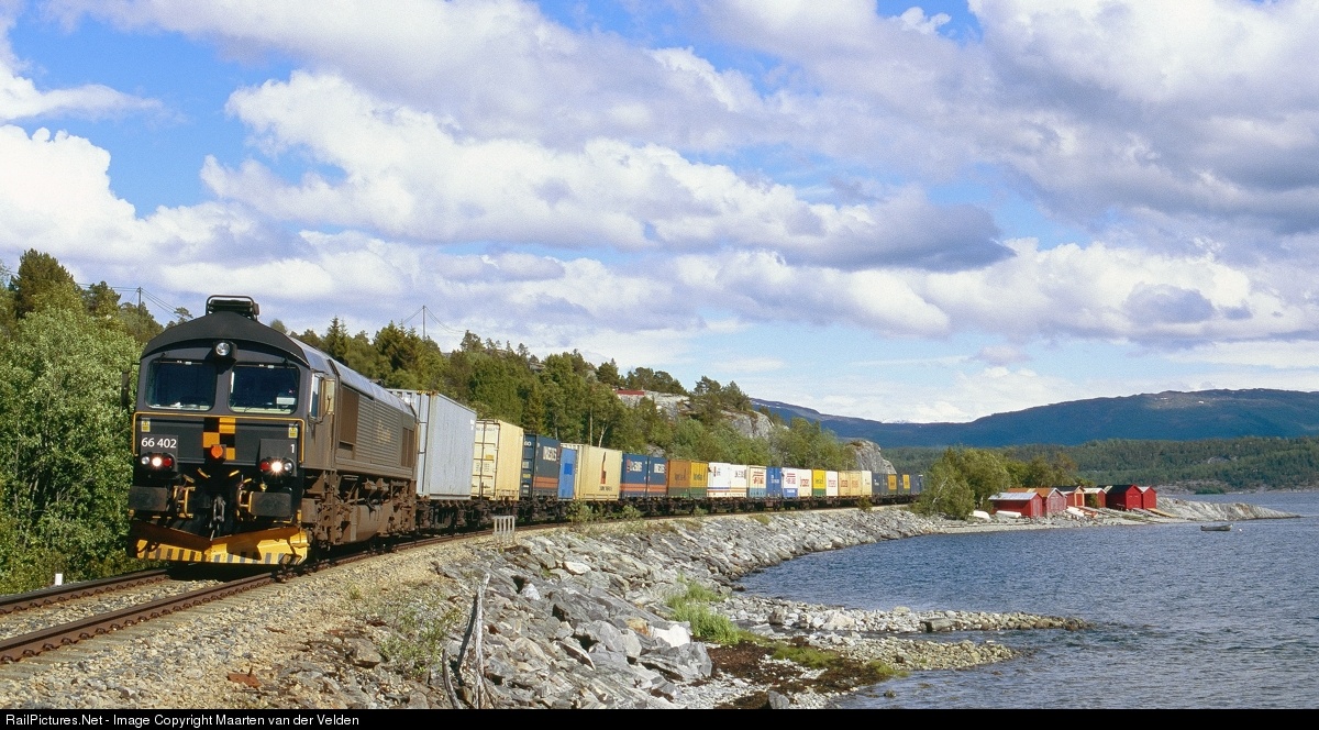 | Cargonet 66 402 with train 5793 from Trondheim to Bodø passes a couple of robuer (fishermans cabins) on the banks of the Valnesfjorden. |