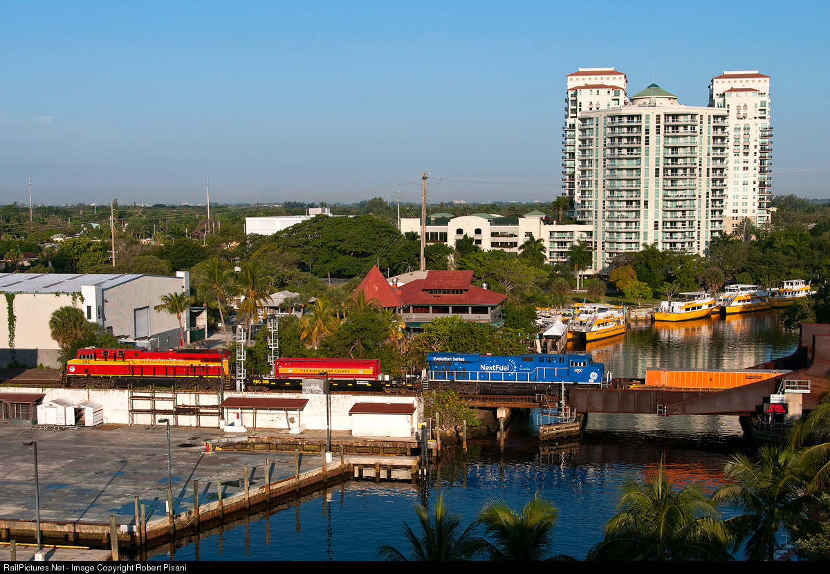 The "class" FEC GEVO leads an LNG fuel tender and GECX 3000 across the New River bridge in Fort Lauderdale's Riverwalk district on a beautiful spring morning in south Florida.