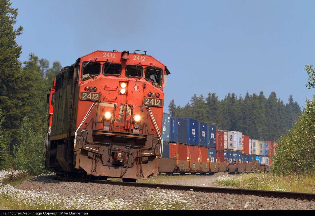 Canadian National train no. 118 heads east through a curve near West Fitzwilliam, British Columbia, on July 14, 2014. The train is led by an older workhorse in the CN fleet—a bit faded, battered and dirty GE C40-8M “cowl” No. 2412—but still capable of powering an intermodal up Yellowhead Pass.