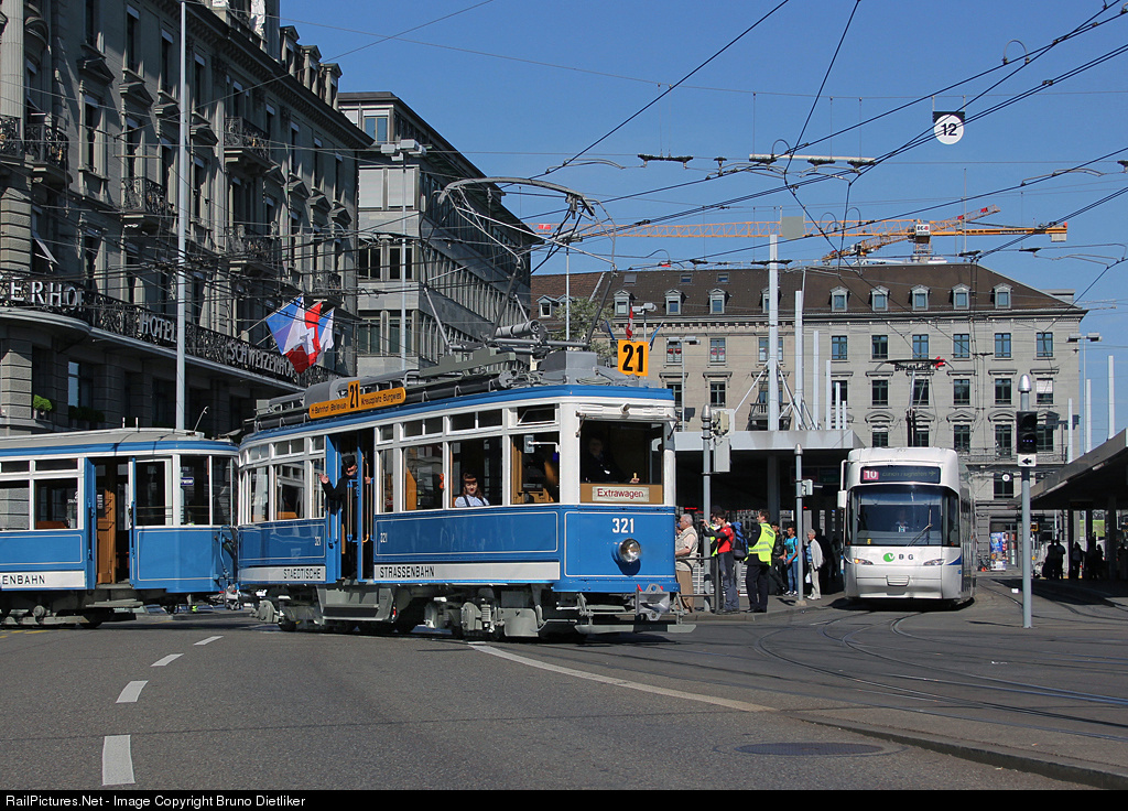 | Old meets new: Oldtimer parade in Zürich. This tramway is called 'Elephant' ('heavy construction'). On the right side the newest tramway 'Cobra' (line 10 toward the Airport) |