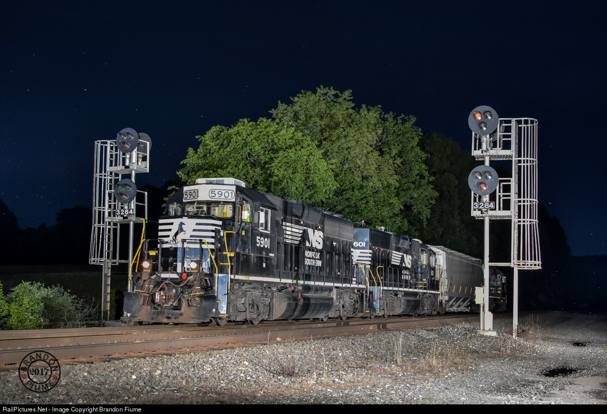 | A Norfolk Southern local passes the Conrail style tri-light signals in Penn, PA with a JBS rebuild leading. Juniata rebuilt the Norfolk Southern fleet of GP38AC locomotives and reclassified them to GP22ECO in 2011. |