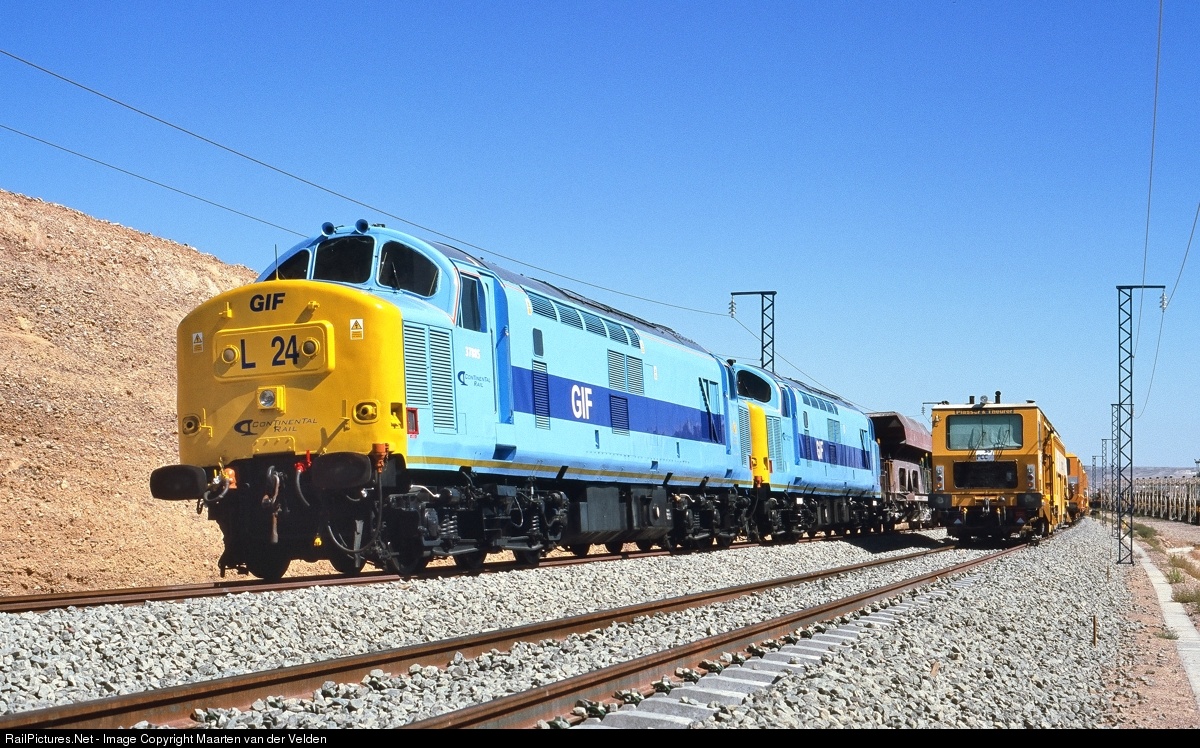 | In Salillas de Jalón was a base for the rolling stock used on building the AVE Madrid - Zarragoza. Also trains were loaded there with gravel supplied by road. The second locomotive is 37 888. |