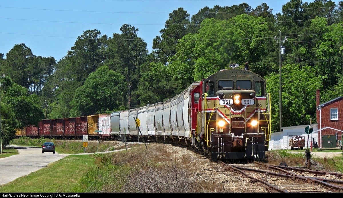 This is rural railroading at its finest as the former Carolina Southern 951 rumbles around the curve into Fair Bluff, NC. It has a train of roughly 27 cars, with the hoppers going into storage near Chadbourn, NC and the rest of the cars headed for Canfor Lumber in Conway, SC.