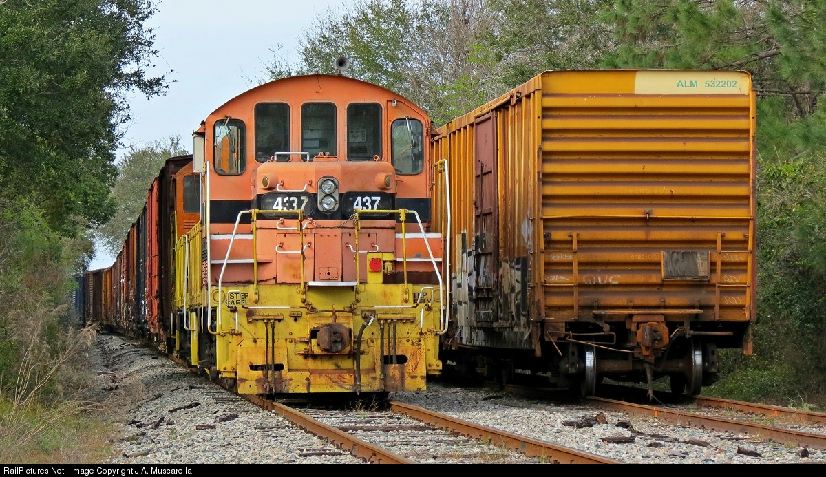 The unique GP7U run by the First Coast Railroad in Fernandina Beach, FL sits on the mainline ready to go for the next day. It will haul this cut of cars to the CSX interchange in Yulee, just a short distance away. One will notice the odd shape to 437's cab. It is one of only a small handful in the country that feature this unique style. The engine was built in the early 1950s for the TAG Railroad and has been faithfully hauling freight for the past 65+ years. The Genesee & Wyoming logo on the side is still labeled for the Golden Isles Terminal Railroad where it once served out of Brunswick, GA.