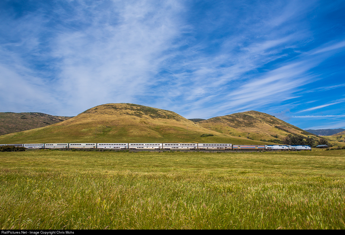 | The afternoon sun glistens off the southbound No.14, the coast Starlight, as it travels through the ranch lands on the outskirts of San Luis Obispo. |