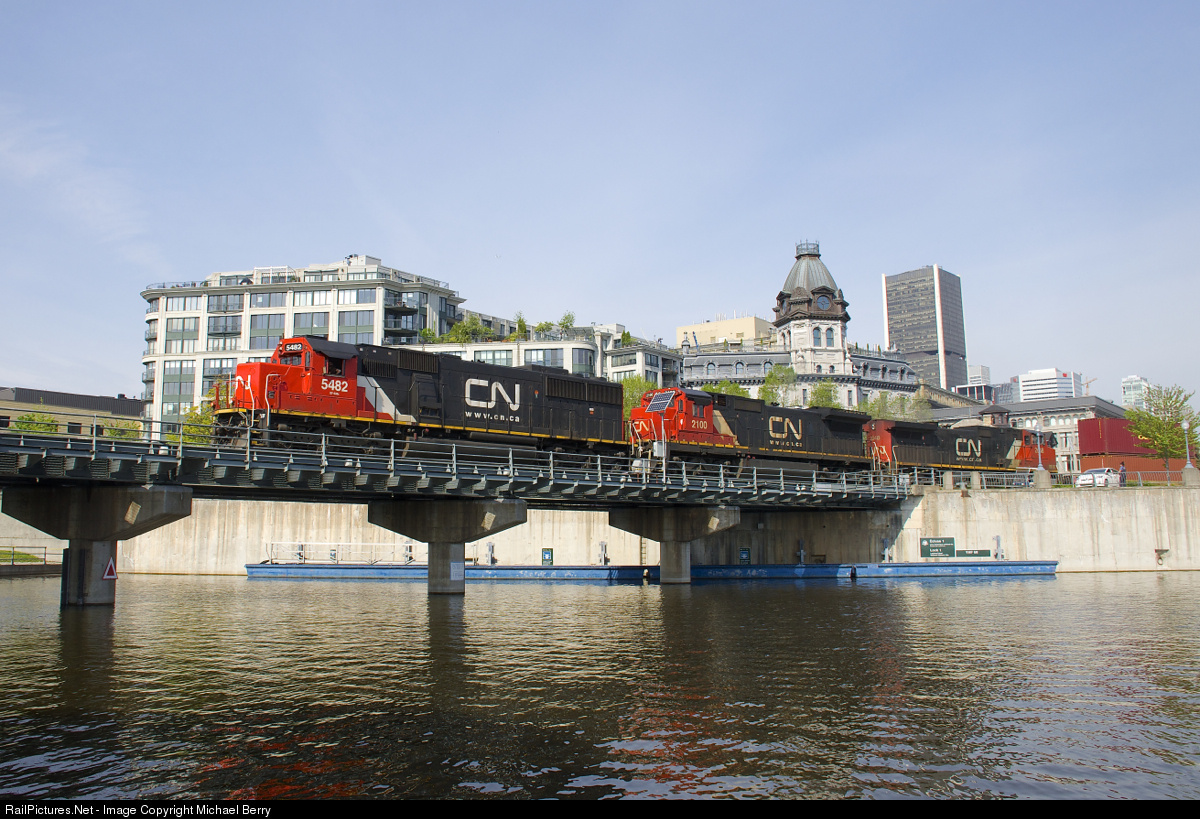| Two secondhand standard cabs up front. CN 149 is leaving the Port of Montreal with two standard cab units that CN picked up secondhand (SD60 CN 5482 & C40-8 CN 2100), with CN 2648 third. The train is leaving the port a bit later than usual as it crosses the Lachine Canal. |