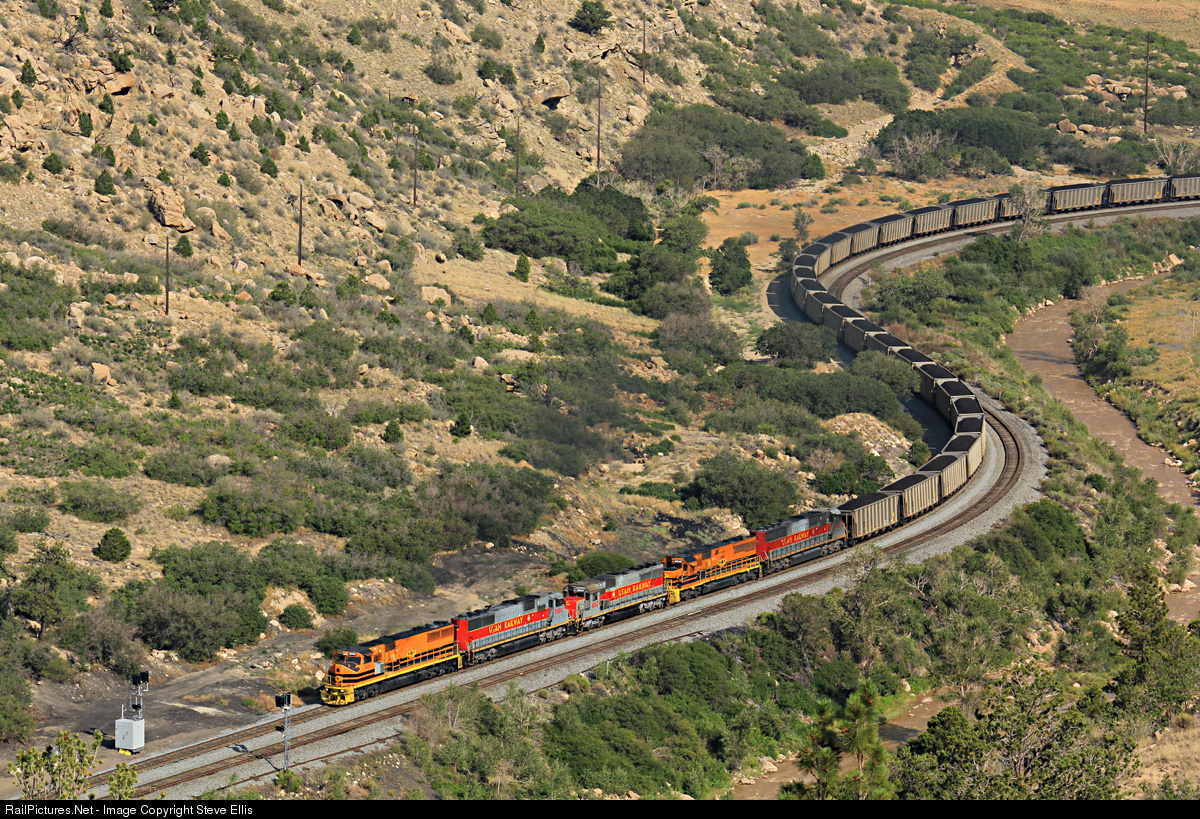 | MK50-3's and SD50S's maneuver the curve of the Price River canyon with a loaded coal train. Sadly Utah Railway is now out of the coal business, and the MK50-3 are gone. |
