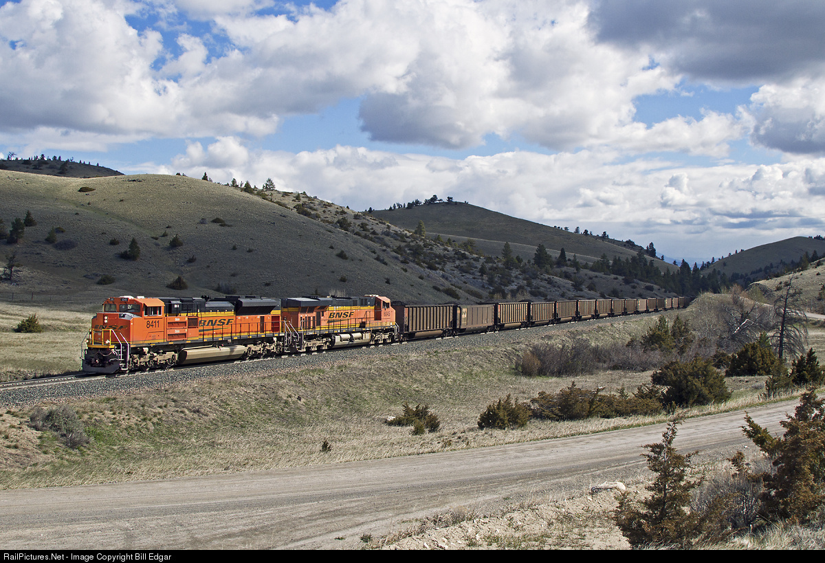 | BNSF 8411 grinds upgrade nearing the east switch at Austin, MT with a loaded coal train westbound out of Helena. It will meet an eastbound empty coal train already waiting at Austin as it continues its climb up Mullan Pass. |
