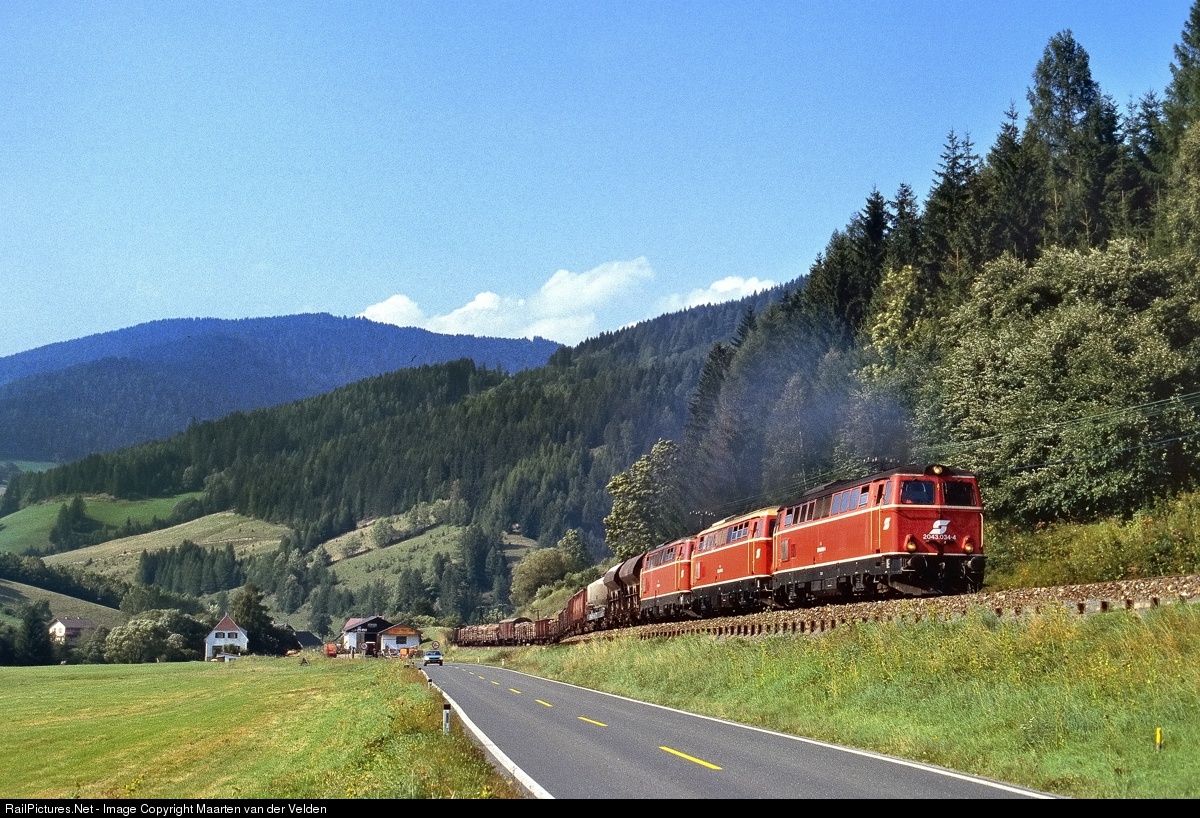 | On the Lavanttalbahn is much freight transportaton. Therefore most freighttrains are heavy. Three engines were needed for this freight train to cope with the steep gradients of the Obdacher Sattel. The train was hauled by 2043 034-4, 2043 558-2 and 2043 557-4. |